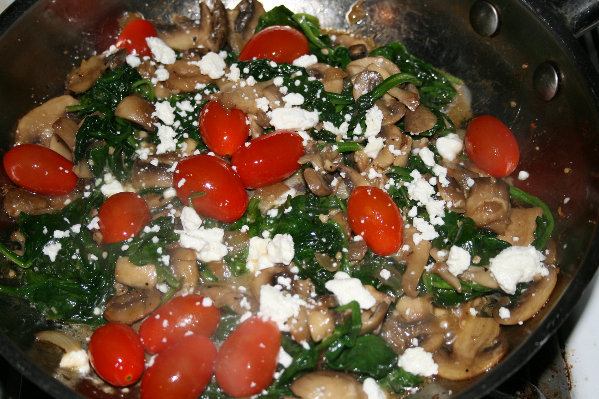 3 TB olive oil with 3 TB chopped onion, 1 cup sliced mushrooms, 1 TB minced garlic and 4 cups raw spinach, a handful of grape tomatoes, and a sprinkle of feta cheese. YUM… tuna salad on toast and pineapple slices.